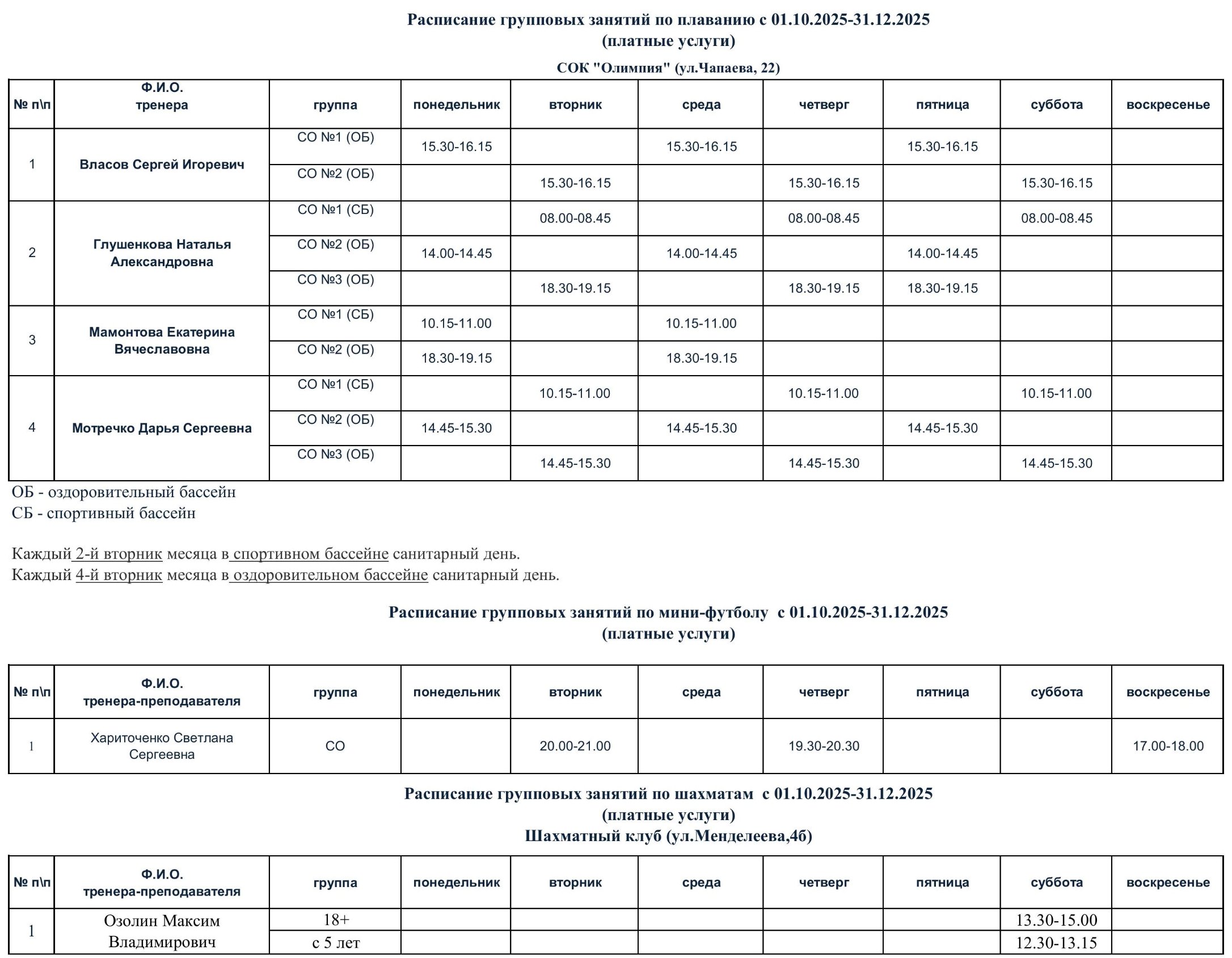 Реализуются программы групповых занятий по плаванию, шахматам и мини-футболу: